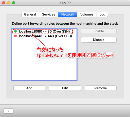 ※「General」タブでGo to Applicationをクリック(Webブラウザが開く)→ 右上のphpMyAdminのリンクの場合、XAMPP用のIPアドレスを使用することになるが、この場合は「アクセス禁止」というメッセージが表示される。このIPアドレスでphpMyAdminを使用したい場合はhttpd-xampp.confですべての接続を許可するという設定を行う必要がある。