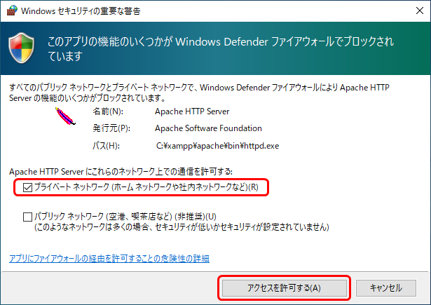 ダウンロードしたファイルを実行し、画面に従ってインストールを実施してください。 途中、「Windowsセキュリティの重要な警告」が表示され、「Apache HTTP Serverにこれらのネットワーク上での通信を許可する」というメッセージが表示されたら「パブリック ネットワーク」をオフ、「プライベート ネットワーク」をオンにして、「アクセスを許可する(A)」をクリックします。