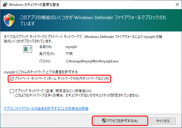 MySQLの初回実行時は、「Windowsセキュリティの重要な警告」が表示され、「mysqldにこれらのネットワーク上での通信を許可する」というメッセージが表示されるので「パブリック ネットワーク」をオフ、「プライベート ネットワーク」をオンにして、「アクセスを許可する(A)」をクリックします。