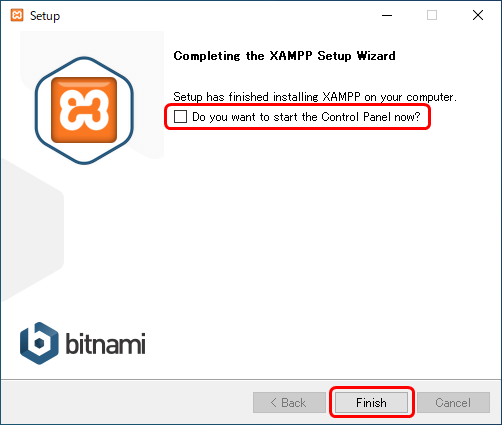 最後に「Do you want to start the Control Panel now?」というメッセージが表示されるので、 オフにして「Finish」をクリックします。 オフにせず「Finish」をクリックすると「XAMPP Control Panel」が開きますが、いったん終了してください。