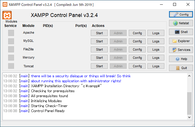 参考:XAMPP Control Panelを「管理者として実行」していない場合