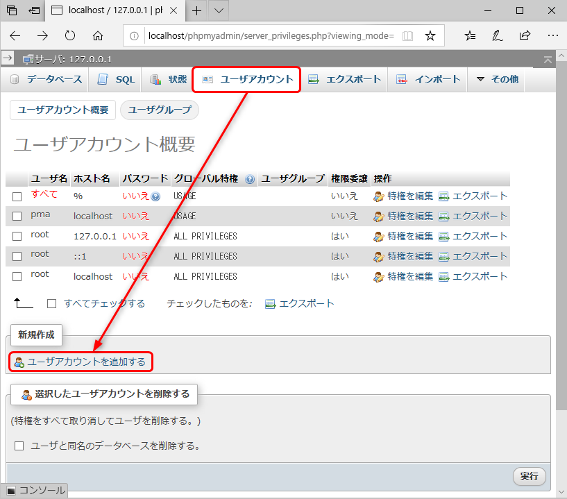 phpMyAdminの「ユーザアカウント」で「新規作成」の「ユーザアカウントを追加する」をクリックします。