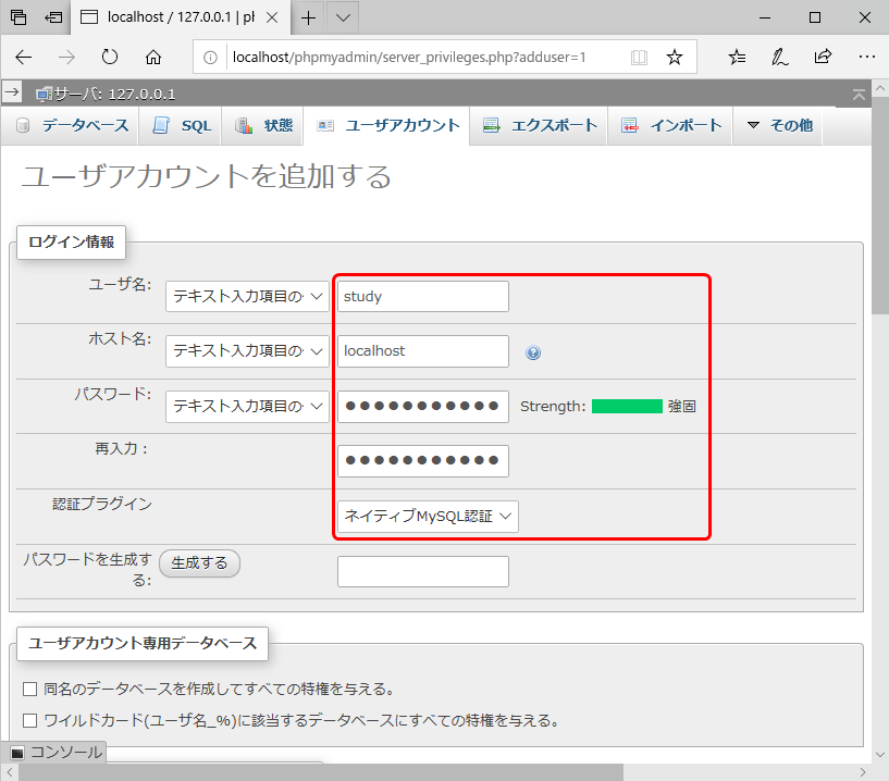 ホスト名は「localhost」、認証プラグインは「ネイティブMySQL認証」を選択してください。