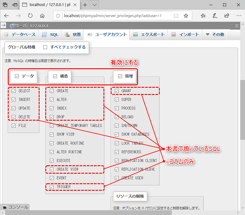 「グローバル特権」で「データ」「構造」「管理」にチェックを入れます。